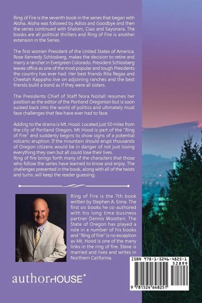 Ring of Fire is the seventh book in the series that began with Aloha. Aloha was followed by Adios and Goodbye and then the series continued with Shalom, Ciao and Sayonara. The books are all political thrillers and Ring of Fire is another extension in the Series. The first women President of the United States of America, Rose Kennedy Schlosberg, makes the decision to retire and marry a rancher in Evergreen Colorado. President Schlosberg leaves office as one of the most popular and tough Presidents the country has ever had. Her best friends Rita Regas and Cheetah Rappaho live on adjoining ranches and the best friends build a bond as if they were all sisters. The Presidents Chief of Staff Nora Noitall resumes her position as the editor of the Portland Oregonian but is soon sucked back into the world of politics and ultimately must face challenges that few have ever had to face. Adding to the drama is Mt. Hood. Located just 50 miles from the city of Portland Oregon, Mt Hood is part of the "Ring of Fire" and suddenly begins to show signs of a potential volcanic eruption. If the mountain should erupt thousands of Oregon citizens would be in danger of not just losing everything they own but all could lose their lives. Ring of fire brings forth many of the characters that those who follow the series have learned to know and enjoy. The challenges presented in the book, along with all of the twists and turns ,will keep the reader guessing.