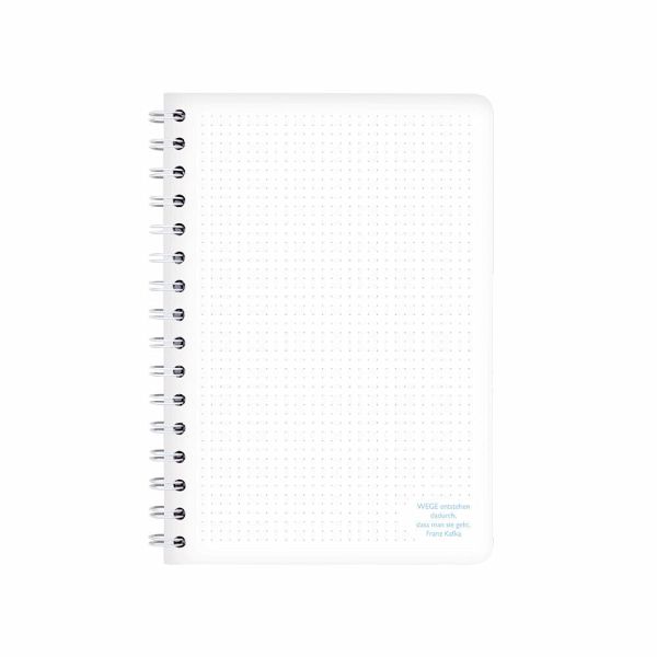 Notizbuch mit Ringbindung im Format A6 mit 100 Blatt 80 g/m² Papier mit dezent gepunkteten Linien. Das Cover hat abgerundete Ecken und ist außen samtweich laminiert und innen farbig. Das Covermotiv ist beidseitig auf einer Ecke der Innenseite in Farbe gedruckt.