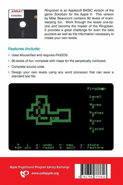 Ringoban is an Applesoft BASIC version of the game Sokoban for the Apple II. This version by Mike Beaumont contains 90 levels of brain-warping fun. Work through the levels one-by-one and become the master of the Ringoban. It provides a great challenge for even the best puzzlers as well as the information necessary to create your own levels. Features Include: - Uses MouseText and requires ProDOS. - 90 levels of fun, complete with maps for the perpetually confused. - Complete source code. - Design your own levels using any word processor that can save a standard text file.