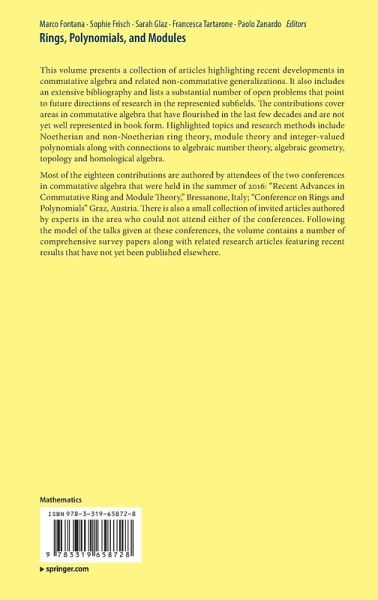 Preface.- 1 Reducing Fractions to Lowest Terms.- 2 Unique Factorization in Torsion-free Modules.- 3 n-Absorbing Ideals of Commutative Rings and Recent Progresses on Three Conjectures: A Survey.- 4 Embedding Dimension and Codimension of Tensor Products of Algebras Over a Field.- 5 Minimal Generating Sets for the D-Algebra Int(S,D).- 6 Algebraic Entropy in Locally Linearly Compact Vector Spaces.- 7 Commutative Rings Whose Finitely Generated Ideals are Quasi-Flat.- 8 Commutative Rings with a Prescribed Number of Isomorphism Classes of Minimal Ring Extensions.- 9 Applications of Multisymmetric Syzygies in Invariant Theory.- 10 Functorial Properties of Star Operations: New Developments.- 11 Systems of Sets of Lengths: Transfer Krull Monoids Versus Weakly Krull Monoids.- 12 Corners Realization Theorems from the Viewpoint of Algebraic Entropy.- 13 Directed Unions of Local Quadratic Transforms of Regular Local Rings and Pullbacks.- 14 Divisorial Prime Ideals in PrüferDomains.- 15 A gg-Cancellative Semistar Operation on an Integral Domain Need Not Be gh-Cancellative.- 16 Quasi-Prüfer Extensions of Rings.- 17 A Note on Analytically Irreducible Domains.- 18 Integer-valued Polynomials on Algebras: A Survey of Recent Results and Open Questions.