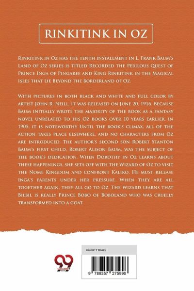 Rinkitink in Oz has the tenth installment in L. Frank Baum's Land of Oz series is titled Recorded the Perilous Quest of Prince Inga of Pingaree and King Rinkitink in the Magical Isles that Lie Beyond the Borderland of Oz. With pictures in both black and white and full color by artist John R. Neill, it was released on June 20, 1916. Because Baum initially wrote the majority of the book as a fantasy novel unrelated to his Oz books over 10 years earlier, in 1905, it is noteworthy Until the book's climax, all of the action takes place elsewhere, and no characters from Oz are introduced. The author's second son Robert Stanton Baum's first child, Robert Alison Baum, was the subject of the book's dedication. When Dorothy in Oz learns about these happenings, she sets off with the Wizard of Oz to visit the Nome Kingdom and confront Kaliko. He must release Inga's parents under her pressure. When they are all together again, they all go to Oz. The Wizard learns that Bilbil is really Prince Bobo of Boboland who was cruelly transformed into a goat.