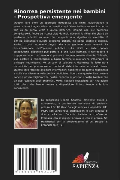 Questo libro offre un approccio dettagliato alla rinite, evidenziando le preoccupazioni legate alle sue complicazioni. Viene trattato un ampio spettro che va da quello virale a quello batterico, insieme alle sue potenziali complicazioni. Anche se riconosciuta da molti decenni, la rinite allergica è un problema infantile comune che comporta una significativa morbilità. È difficile quantificare questo problema globale, ma senza dubbio è enorme. Anche i costi economici legati alla sua gestione sono enormi. La sensibilizzazione dell'opinione pubblica sulla rinite e sulle opzioni terapeutiche disponibili può portare a una cura ottimale. Il raffreddore è troppo comune, ma quando si presenta frequentemente durante l'infanzia, può portare a complicazioni a lungo termine e può anche influenzare lo sviluppo neurologico. Ho cercato di valutare criticamente la letteratura disponibile per presentare un punto di vista informato su questo tema. Questo libro fornisce al lettore informazioni aggiornate su questo argomento e sulla sua rilevanza nella pratica quotidiana. Spero che questo libro breve e conciso possa migliorare la nostra capacità di gestire i nostri bambini con un uso razionale degli antibiotici. Vorrei cogliere l'occasione per ringraziare tutti coloro che hanno messo a disposizione il loro tempo e le loro conoscenze.