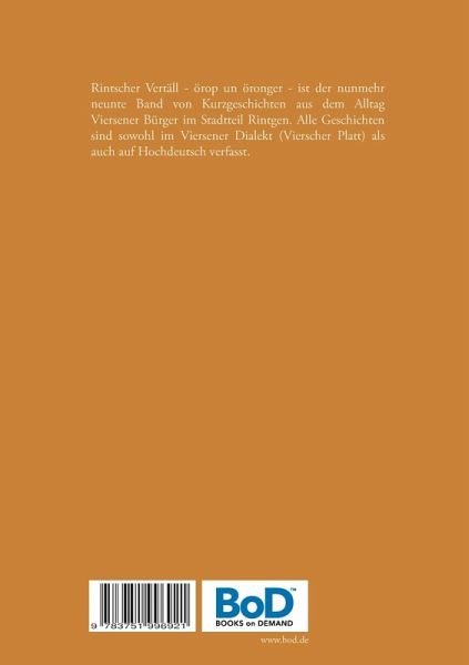 Rintscher Vertäll - örop un öronger - ist der nunmehr neunte Band von Kurzgeschichten aus dem Alltag Viersener Bürger im Stadtteil Rintgen. Alle Geschichten sind sowohl im Viersener Dialekt (Vierscher Platt) als auch auf Hochdeutsch verfasst.