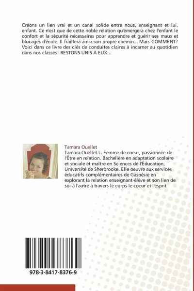 Créons un lien vrai et un canal solide entre nous, enseignant et lui, enfant. Ce n'est que de cette noble relation qu'émergera chez l'enfant le confort et la sécurité nécessaires pour apprendre et guérir ses maux et blocages d'école. Il fraillera ainsi son propre chemin... Mais COMMENT? Voici dans ce livre des clés de conduites claires à incarner au quotidien dans nos classes! RESTONS UNIS À EUX...