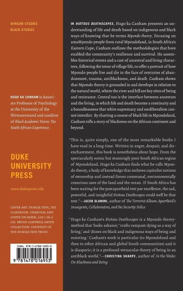 In Riotous Deathscapes, Hugo ka Canham presents an understanding of life and death based on indigenous and black ways of knowing that he terms Mpondo theory. Focusing on amaMpondo people from rural Mpondoland, in South Africa's Eastern Cape, Canham outlines the methodologies that have enabled the community's resilience and survival. He assembles historical events and a cast of ancestral and living characters, following the tenor of village life, to offer a portrait of how Mpondo people live and die in the face of centuries of abandonment, trauma, antiblackness, and death. Canham shows that Mpondo theory is grounded in and develops in relation to the natural world, where the river and hill are key sites of being and resistance. Central too, is the interface between ancestors and the living, in which life and death become a continuity and a boundlessness that white supremacy and neoliberalism cannot interdict. By charting a course of black life in Mpondoland, Canham tells a story of blackness on the African continent and beyond.