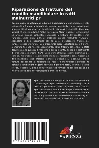 Questo studio ha valutato gli indicatori di riparazione e malnutrizione in ratti sottoposti a frattura unilaterale del condilo mandibolare e a malnutrizione proteica (8% di proteine con supplementi vitaminici e minerali). Sono stati utilizzati 45 maschi adulti di Rattus norvegicus Wistar, suddivisi in 3 gruppi di 15 animali: gruppo fratturato, sottoposto a frattura del condilo, senza variazione della dieta (23% di proteine); gruppo malnutrito fratturato, sottoposto a dieta ipoproteica per 30 giorni e successiva frattura del condilo; gruppo malnutrito, con precedente dieta ipoproteica per 30 giorni, mantenuto fino alla fine dell'esperimento, senza frattura del condilo. È stata documentata la quantità di mangime e acqua ingerita, il peso e il coefficiente di efficienza alimentare (CEA). Sono stati effettuati esami biochimici del sangue, misurazioni cefalometriche mediante radiografie della mascella e della mandibola, studi istologici e analisi statistiche. Si è concluso che la frattura del condilo mandibolare nei ratti con malnutrizione proteica ha portato a cambiamenti negativi nei valori di proteine totali, albumina e calcio sierico, leucocitosi, oltre a compromettere la formazione del callo osseo e a indurre atrofia della fibrocartilagine e anchilosi fibrosa.
