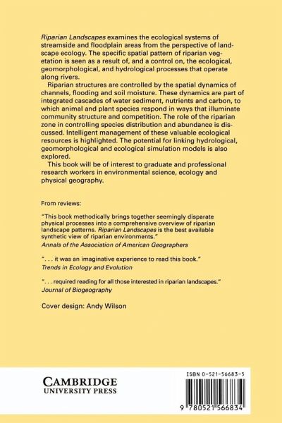 Riparian Landscapes examines the ecological systems of streamside and floodplain areas from the perspective of landscape ecology. The specific spatial pattern of riparian vegetation is seen as a result of, and a control on, the ecological, geomorphological, and hydrological processes that operate along rivers. Riparian structures are controlled by the spatial dynamics of channels, flooding and soil moisture. These dynamics are part of integrated cascades of water, sediment, nutrients and carbon, to which animal and plant species respond in ways that illuminate community structure and competition. The role of the riparian zone in controlling species distribution and abundance is discussed. Intelligent management of these valuable ecological resources is highlighted. The potential for linking hydrological, geomorphological and ecological simulation models is also explored. This book will be of interest to graduate and professional research workers in environmental science, ecology and physical geography.
