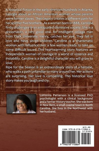 A historical fiction in the early nineteen hundreds in Atlanta, Georgia about an African American woman whose parents were former slaves. Their legacy creates a different path for her and her five brothers. As a woman born in 1888, Caroline finds challenges in an antiquated dismissive society. She is a dressmaker, a very good one. An intelligent college man from Clark University, Henry, catches her eye. They fall in love and have seven children. Caroline is a charismatic woman with influence over a few women ready to take on some difficult issues. This heartwarming story features an independent woman of courage in a world of violence and instability. Caroline is a delightful character you will grow to love. Ripe for a Season is an extraordinary story of a heroine, who walks a path unfamiliar to many around her. Her actions are surprising. Her love is compelling. This historical love story makes you laugh and cry.