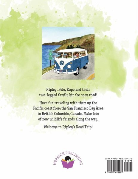 Ripley, Pele, Kapo and their two-legged family hit the open road in their newly converted electric van! Have fun traveling with them up the Pacific Coast, from the San Francisco Bay Area to Vancouver, British Colombia. Dip your toe beans in the big blue ocean and make lots of new splashing, hopping, burrowing friends along the way! A wonderful book for elementary school readers, filled with vibrant watercolor illustrations and engaging, funny animal adventures. Welcome to Ripley's Road Trip, book 3 in the Ripley and Friendz collection!