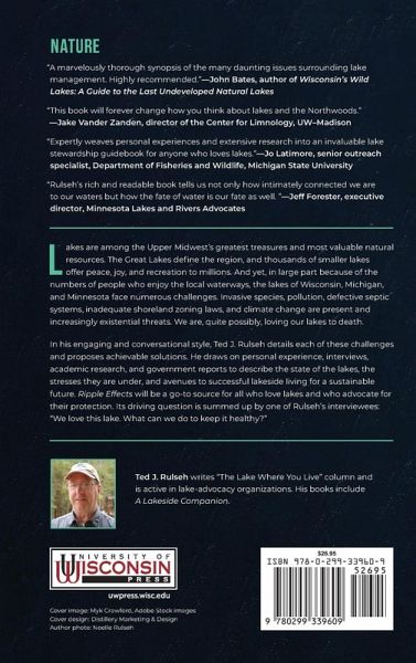 Lakes are among the Upper Midwest’s greatest treasures and most valuable natural resources. The Great Lakes define the region, and thousands of smaller lakes offer peace, joy, and recreation to millions. And yet, in large part because of the numbers of people who enjoy the local waterways, the lakes of Wisconsin, Michigan, and Minnesota face numerous challenges. Invasive species, pollution, defective septic systems, inadequate shoreland zoning laws, and climate change are present and increasingly existential threats. We are, quite possibly, loving our lakes to death. In his engaging and conversational style, Ted Rulseh details each of these challenges and proposes achievable solutions. He draws on personal experience, interviews, academic research, and government reports to describe the state of the lakes, the stresses they are under, and avenues to successful lakeside living for a sustainable future. Ripple Effects will be a go-to source for all who love lakes and who advocate for their protection; its driving question is summed up by one of Rulseh’s interviewees: “We love this lake. What can we do to keep it healthy?”
