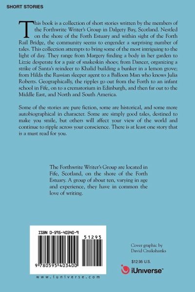 This book is a collection of short stories written by the members of the Forthwrite Writer's Group in Dalgety Bay, Scotland. Nestled on the shore of the Forth Estuary and within sight of the Forth Rail Bridge, the community seems to engender a surprising number of tales. This collection attempts to bring some of the most intriguing to the light of day. They range from Margery finding a body in her garden to Lizzie desperate for a pair of snakeskin shoes; from Dancer, organizing a strike of Santa's reindeer to Khalid building a bunker in a lemon grove; from Hilda the Russian sleeper agent to a Balloon Man who knows Julia Roberts. Geographically, the ripples go out from the Forth to an infant school in Fife, on to a crematorium in Edinburgh, and then far out to the Middle East, and North and South America. Some of the stories are pure fiction, some are historical, and some more autobiographical in character. Some are simply good tales, destined to make you smile, but others will affect your view of the world and continue to ripple across your conscience. There is at least one story that is a must read for you.