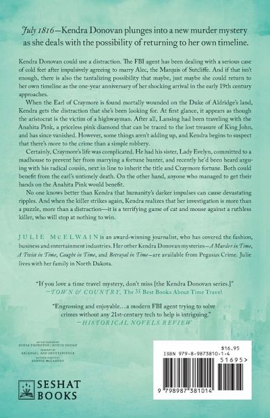 July 1816-Kendra Donovan could use a distraction. The FBI agent has been dealing with a serious case of cold feet after impulsively agreeing to marry Alec, the Marquis of Sutcliffe. And if that isn't enough, there is also the tantalizing possibility that maybe, just maybe she could return to her own timeline as the one-year anniversary of her shocking arrival in the early 19th century approaches. When Reginald Lansing, the Earl of Craymore, is found mortally wounded on the Duke of Aldridge's land, Kendra gets the distraction that she's been looking for. At first glance, it appears as though the aristocrat is the victim of a highwayman. After all, Lansing had been traveling with the Anahita Pink, a priceless pink diamond that can be traced to the lost treasure of King John, and has since vanished. However, some things aren't adding up, and Kendra begins to suspect that there's more to the crime than a simple robbery. Certainly, Craymore's life proves to be complicated. He had his sister, Lady Evelyn, committed to a madhouse to prevent her from marrying a fortune hunter, and recently he'd been heard arguing with his radical cousin, who is next in line to inherit the title and Craymore fortune. Both could benefit from the earl's untimely death. On the other hand, anyone who managed to get their hands on the Anahita Pink would benefit. No one knows better than Kendra that humanity's darker impulses can cause devastating ripples. And when the killer strikes again, Kendra realizes that her investigation is more than a puzzle, more than a distraction-it is a terrifying game of cat and mouse against a ruthless killer, who will stop at nothing to win.