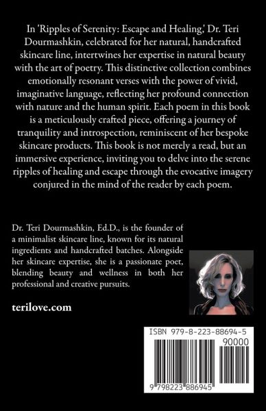 In 'Ripples of Serenity: Escape and Healing,' Dr. Teri Dourmashkin, celebrated for her natural, handcrafted skincare line, intertwines her expertise in natural beauty with the art of poetry. This distinctive collection combines emotionally resonant verses with the power of vivid, imaginative language, reflecting her profound connection with nature and the human spirit. Each poem in this book is a meticulously crafted piece, offering a journey of tranquility and introspection, reminiscent of her bespoke skincare products. This book is not merely a read, but an immersive experience, inviting you to delve into the serene ripples of healing and escape through the evocative imagery conjured in the mind of the reader by each poem.