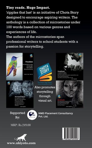 Tiny reads. Huge Impact.'ripples that last' is an initiative of Chota Storydesigned to encourage aspiring writers. Theanthology is a collection of microstories under100 words based on various genres andexperiences of life. The authors of the microstories spanprofessional writers to school students with apassion for storytelling.