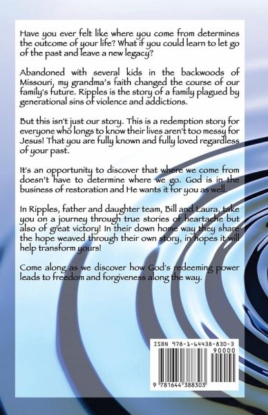 Have you ever felt like where you come from determines the outcome of your life? What if you could learn to let go of the past and leave a new legacy? Abandoned with several kids in the backwoods of Missouri, my grandma's faith changed the course of our family's future. Ripples is the story of a family plagued by generational sins of violence and addictions. But this isn't just our story. This is a redemption story for everyone who longs to know their lives aren't too messy for Jesus! That you are fully known and fully loved regardless of your past. It's an opportunity to discover that where we come from doesn't have to determine where we go. God is in the business of restoration and He wants it for you as well. In Ripples, father and daughter team, Bill and Laura, take you on a journey through true stories of heartache but also of great victory! In their down home way they share the hope weaved through their own story, in hopes it will help transform yours! Come along as we discover how God's redeeming power leads to freedom and forgiveness along the way.