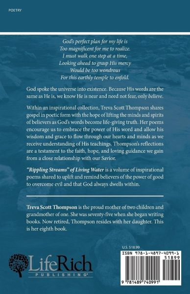 God's perfect plan for my life is Too magnificent for me to realize. I must walk one step at a time, Looking ahead to grasp His mercy Would be too wondrous For this earthly temple to enfold. God spoke the universe into existence. Because His words are the same as He is, we know He is near and need not fear, only believe. Within an inspirational collection, Treva Scott Thompson shares gospel in poetic form with the hope of lifting the minds and spirits of believers as God's words become life-giving truth. Her poems encourage us to embrace the power of His word and allow his wisdom and grace to flow through our hearts and minds as we receive understanding of His teachings. Thompson's reflections are a testament to the faith, hope, and loving guidance we gain from a close relationship with our Savior. "Rippling Streams" of Living Water is a volume of inspirational poems shared to uplift and remind believers of the power of good to overcome evil and that God always dwells within.