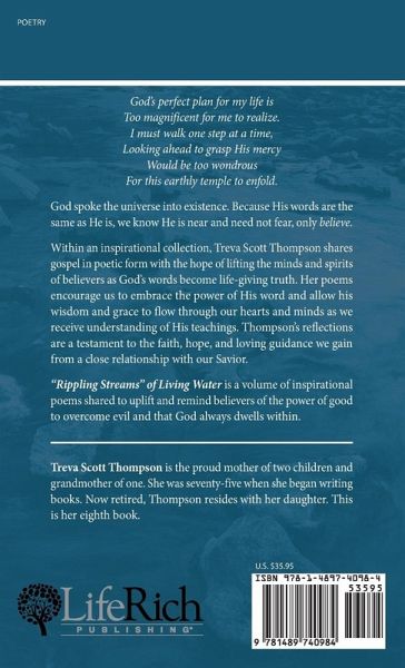 God's perfect plan for my life is Too magnificent for me to realize. I must walk one step at a time, Looking ahead to grasp His mercy Would be too wondrous For this earthly temple to enfold. God spoke the universe into existence. Because His words are the same as He is, we know He is near and need not fear, only believe. Within an inspirational collection, Treva Scott Thompson shares gospel in poetic form with the hope of lifting the minds and spirits of believers as God's words become life-giving truth. Her poems encourage us to embrace the power of His word and allow his wisdom and grace to flow through our hearts and minds as we receive understanding of His teachings. Thompson's reflections are a testament to the faith, hope, and loving guidance we gain from a close relationship with our Savior. "Rippling Streams" of Living Water is a volume of inspirational poems shared to uplift and remind believers of the power of good to overcome evil and that God always dwells within.