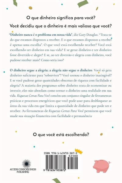 O que dinheiro significa para você? Você decidiu que o dinheiro é mais valioso que você? "Dinheiro nunca é o problema em nossa vida", diz Gary Douglas." É sobre o que estamos dispostos a receber. E o que estamos dispostos a receber é apenas uma escolha". O que você está escolhendo receber? Você está escolhendo ter dinheiro em sua vida? E se gerar dinheiro e ter dinheiro fosse divertido e alegre? E se ao ter diversão e alegria com dinheiro você pudesse receber mais? Como seria isso? O dinheiro segue a alegria; a alegria não segue o dinheiro. Você só gera dinheiro suficiente para "sobreviver"? Você tornou o dinheiro inatingível? E se você pudesse gerar quantidades obscenas de riqueza com facilidade e alegria? A maioria dos programas sobre dinheiro trata de economizar ou investir; eles não abordam como tornar o dinheiro uma realidade em sua vida. Riquezas Certas Para Você contém um conjunto singular de ferramentas práticas e processos energéticos que você pode usar para desbloquear as áreas da sua vida onde limita a quantidade de dinheiro que pode ter e receber. As ferramentas de Riquezas Certas Para Você permitem que você mude sua situação financeira com facilidade e permanência. É simplesmente uma escolha. O que você está escolhendo?