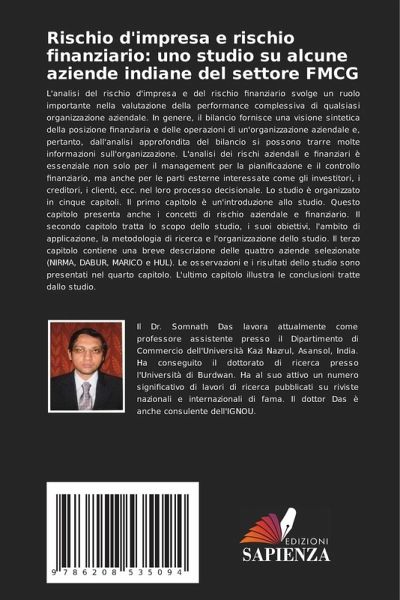 L'analisi del rischio d'impresa e del rischio finanziario svolge un ruolo importante nella valutazione della performance complessiva di qualsiasi organizzazione aziendale. In genere, il bilancio fornisce una visione sintetica della posizione finanziaria e delle operazioni di un'organizzazione aziendale e, pertanto, dall'analisi approfondita del bilancio si possono trarre molte informazioni sull'organizzazione. L'analisi dei rischi aziendali e finanziari è essenziale non solo per il management per la pianificazione e il controllo finanziario, ma anche per le parti esterne interessate come gli investitori, i creditori, i clienti, ecc. nel loro processo decisionale. Lo studio è organizzato in cinque capitoli. Il primo capitolo è un'introduzione allo studio. Questo capitolo presenta anche i concetti di rischio aziendale e finanziario. Il secondo capitolo tratta lo scopo dello studio, i suoi obiettivi, l'ambito di applicazione, la metodologia di ricerca e l'organizzazione dello studio. Il terzo capitolo contiene una breve descrizione delle quattro aziende selezionate (NIRMA, DABUR, MARICO e HUL). Le osservazioni e i risultati dello studio sono presentati nel quarto capitolo. L'ultimo capitolo illustra le conclusioni tratte dallo studio.