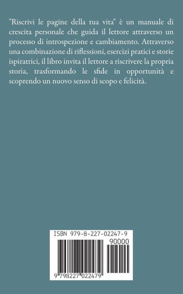 "Riscrivi le pagine della tua vita" è un manuale di crescita personale che guida il lettore attraverso un processo di introspezione e cambiamento. Attraverso una combinazione di riflessioni, esercizi pratici e storie ispiratrici, il libro invita il lettore a riscrivere la propria storia, trasformando le sfide in opportunità e scoprendo un nuovo senso di scopo e felicità.