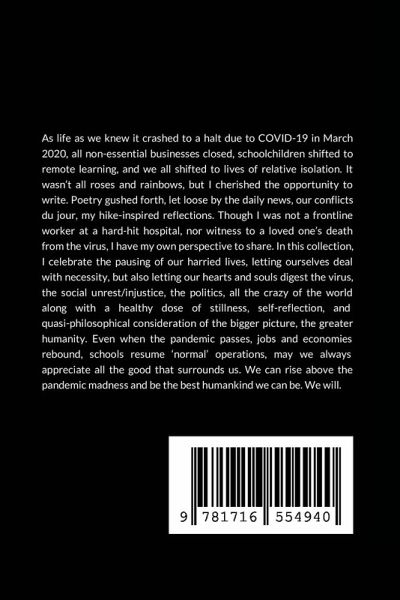 As life as we knew it crashed to a halt due to COVID-19 in March 2020, all non-essential businesses closed, schoolchildren shifted to remote learning, and we all shifted to lives of relative isolation. It wasn't all roses and rainbows, but I cherished the opportunity to write. Poetry gushed forth, let loose by the daily news, our conflicts du jour, my hike-inspired reflections. We all have our own voices, our own pandemic stories to share. Though I was not a frontline worker at a hard-hit hospital, nor witness to a loved one's death from the virus, I have my own perspective to share. This collection showcases the authenticity of pausing our harried lives, letting ourselves deal with necessity, but also letting our hearts and souls digest the virus, the social unrest/injustice, the politics, all the crazy of the world along with a healthy dose of stillness, self-reflection, and quasi-philosophical consideration of the bigger picture, the greater humanity. Even when the pandemic passes, jobs and economies rebound, schools resume 'normal' operations, may we please remember to appreciate all that surrounds us that is good. We can rise above the pandemic madness and be the best humankind we can be.
