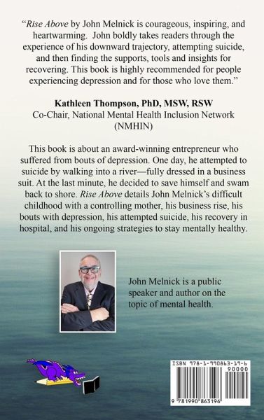 This book is about an award-winning entrepreneur who suffered from bouts of depression. One day, he attempted to suicide by walking into a river-fully dressed in a business suit. At the last minute, he decided to save himself and swam back to shore. Rise Above details John Melnick's difficult childhood with a controlling mother, his business rise, his bouts with depression, his attempted suicide, his recovery in hospital, and his ongoing strategies to stay mentally healthy