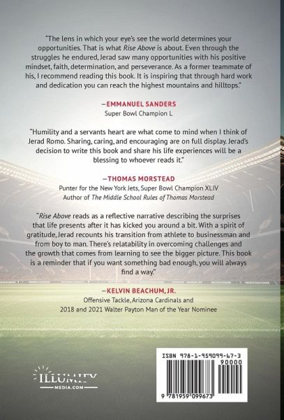 In this compelling memoir, Jerad Romo reflects on a life shaped by hard work, determination, and unexpected twists. From his early days mowing lawns and toiling in carrot fields, to the pinnacle of high school sports triumphs, the journey took a sharp turn when coveted scholarships eluded the athlete. Undeterred, he navigated the challenges of college sports, facing setbacks and ultimately finding success at Southern Methodist University (SMU) in Dallas, Texas. The narrative weaves through personal and professional milestones, from a chance encounter with Carl Sewell Jr. to a lasting bond with football legend Roger Staubach. Now a devoted family man with sixteen years at Sewell Automotive Companies, he imparts the invaluable lessons of faith, generosity, and perseverance. Through highs and lows, Rise Above is a testament to the resilience that fuels the pursuit of greatness-a journey that will resonate with readers, inspiring them to embrace life's lessons with unwavering determination.