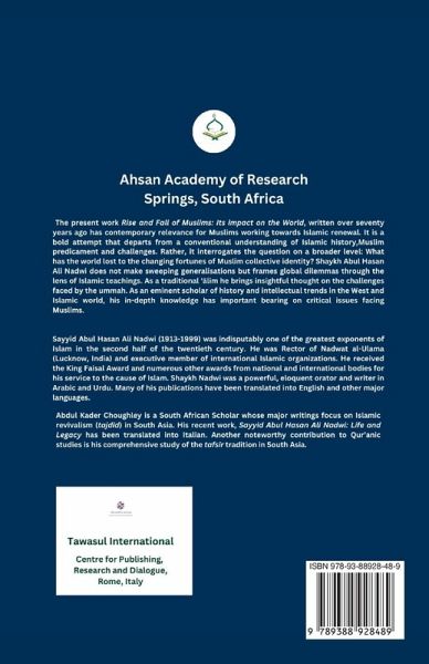 The present work Rise and Fall of Muslims: Its impact on the World, written over seventy years ago has contemporary relevance for Muslims working towards Islamic renewal. It is a bold attempt that departs from a conventional understanding of Islamic history,Muslim predicament and challenges. Rather, it interrogates the question on a broader level: What has the world lost to the changing fortunes of Muslim collective identity? Shaykh Abul Hasan Ali Nadwi does not make sweeping generalisations but frames global dilemmas through the lens of Islamic teachings. As a traditional '¿lim he brings insightful thought on the challenges faced by the ummah. As an eminent scholar of history and intellectual trends in the West and Islamic world, his in-depth knowledge has important bearing on critical issues facing Muslims. Sayyid Abul Hasan Ali Nadwi (1913-1999) was indisputably one of the greatest exponents of Islam in the second half of the twentieth century. He was Rector of Nadwat al-Ulama (Lucknow, India) and executive member of international Islamic organizations. He received the King Faisal Award and numerous other awards from national and international bodies for his service to the cause of Islam. Shaykh Nadwi was a powerful, eloquent orator and writer in Arabic and Urdu. Many of his publications have been translated into English and other major languages. ¿Abdul Kader Choughley is a South African Scholar whose major writings focus on Islamic revivalism (tajd¿d) in South Asia. His recent work, Sayyid Abul Hasan Ali Nadwi: Life and Legacy has been translated into Italian. Another noteworthy contribution to Qur'anic studies is his comprehensive study of the tafs¿r tradition in South Asia.