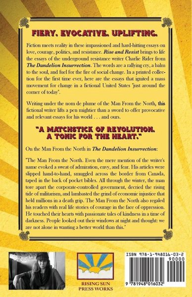 Fiery. Evocative. Uplifting. Fiction meets reality in these impassioned and hard-hitting essays on love, courage, politics, and resistance. Rise and Resist brings to life the essays of the underground resistance writer Charlie Rider from The Dandelion Insurrection. The words are a rallying cry, a balm to the soul, and fuel or the fire of social change. In a printed collection for the first time ever, here are the essays that ignited a mass movement for change in a fictional United States "just around the corner of today". Written under the nom de plume: the Man From the North, this fictional writer lifts a pen mightier than a sword to offer provocative and relevant essays for his world . . . and ours. On the Man From the North in The Dandelion Insurrection: "The Man From the North. Even the mere mention of the writer's name evoked a sweat of admiration, envy and fear. His articles were slipped hand-to-hand, smuggled across the border from Canada, taped in the back of pocket bibles. All through the winter, the man tore apart the corporate-controlled government, decried the rising tide of militarism, and lambasted the grind of economic injustice that held millions in a death grip. The Man From the North also regaled his readers with real life stories of courage in the face of oppression. He touched their hearts with passionate tales of kindness in a time of darkness. People looked out their windows at night and thought: we are not alone in wanting a better world than this." - from The Dandelion Insurrection by Rivera Sun. The essays from the Man From the North are timely and inspiring. They are not found in The Dandelion Insurrection, The Dandelion Insurrection Study Guide - making change through nonviolent action, or in The Roots of Resistance. The essays can be read separately from the novels. Reading all the books together is a powerful experience. Praise for The Dandelion Insurrection & The Roots of Resistance "In times of despair, we need hope. In times of frustration, we need inspiration. In times of confusion, we need clarity. Rivera brings us all of these and more." - Stephen Zunes, Professor of Politics and International Studies at University of San Francisco "Rivera has crafted a vision of an unstoppable movement for democracy and leaves no corner or controversy of nonviolence unexplored. Find yourself within these pages and learn some new techniques for action while you're here." -Stephanie N. Van Hook, Executive Director, Metta Center for Nonviolence ". . . a beautifully written book… punching holes through the concert of corporate terror, and inviting all to join in the insurrection." - Keith McHenry, Co-founder of Food Not Bombs