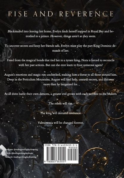 Blackmailed into leaving her home, Evelyn finds herself trapped in Royal Bay and betrothed to a prince. However, things aren't as they seem. To uncover secrets and keep her friends safe, Evelyn must play the part King Dominic demands of her. Freed from the magical bonds that tied her to a tyrant king, Nora is forced to reconcile with her past actions. But can she ever learn to trust someone again? August's emotions and magic run unchecked, making him a threat to all those around him. Deep in the Periculum Mountains, August will find help, unearth secrets, and discover more than he bargained for. As all three battle their own demons, a greater evil grows with each sacrifice to the Makers. The rebels will rise. The king will demand reverence. Valmenessia will be changed forever.