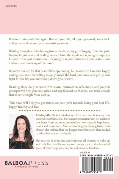 It's time to rise and shine again. Reclaim your life, take your personal power back and get started on your path towards greatness. Battling through self-doubt, negative self-talk, letting go of baggage from the past, finding forgiveness, and healing yourself from the inside out is going to require more than just motivation. It's going to require daily attention and action, and a whole new mindset. It's never too late for that beautiful happy ending, but in order to have that happy ending, you must be willing to ask yourself the hard questions, and get up and fight for the life you know deep down you deserve. Reading these daily morsels of wisdom, motivation, reflections, and journal prompts will help you take action, stay focused and centred, so that you can unlock that inner strength within, and live your life happy, health and whole again.