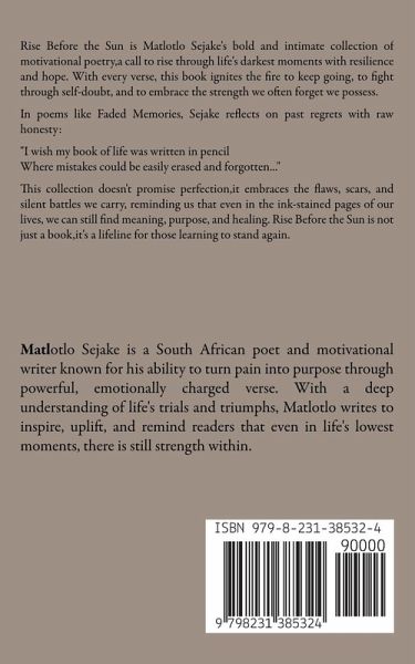 Rise Before the Sun is Matlotlo Sejake's bold and intimate collection of motivational poetry, a call to rise through life's darkest moments with resilience and hope. With every verse, this book ignites the fire to keep going, to fight through self-doubt, and to embrace the strength we often forget we possess. In poems like Faded Memories, Sejake reflects on past regrets with raw honesty: "I wish my book of life was written in pencil Where mistakes could be easily erased and forgotten..." This collection doesn't promise perfection, it embraces the flaws, scars, and silent battles we carry, reminding us that even in the ink-stained pages of our lives, we can still find meaning, purpose, and healing. Rise Before the Sun is not just a book, it's a lifeline for those learning to stand again.