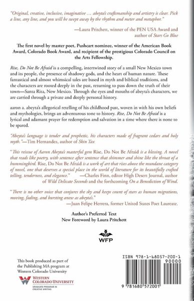 The first novel by master poet, Pushcart nominee, winner of the American Book Award, Colorado Book Award, and recipient of the prestigious Colorado Council on the Arts Fellowship. Rise, Do Not Be Afraid is a compelling, intertwined story of a small New Mexico town and its people, the presence of shadowy gods, and the heart of human nature. These fantastical and almost whimsical tales are based in myth and biblical traditions, and the characters are rooted deeply in the past, returning to pass down the truth of their town-Santa Rita, New Mexico. Through the eyes and mouths of abeyta's characters, we are carried through a private and deeply personal history. aaron a. abeyta's allegorical retelling of his childhood past, woven in with his own beliefs and mythologies, brings an adventurous tone to history. Rise, Do Not Be Afraid is a lyrical and adamant prayer for redemption and salvation in a time where there is none to be spared. "Original, creative, inclusive, imaginative ... abeyta's craftsmanship and artistry is clear. Pick a line, any line, and you will be swept away by the rhythm and meter and metaphor."-Laura Pritchett, winner of the PEN USA Award and author of Stars Go Blue "There is no other voice that conjures the sky and keeps count of stars as human migrations, moving, fading, and bursting anew as abeyta's."-Juan Felipe Herrera, former United States Poet Laureate