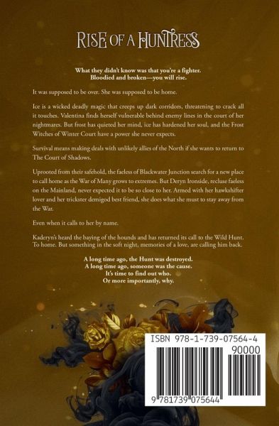What they didn't know was that you're a fighter. Bloodied and broken-you will rise. It was supposed to be over. She was supposed to be home. Ice is a wicked deadly magic that creeps up dark corridors, threatening to crack all it touches. Valentina finds herself vulnerable behind enemy lines in the court of her nightmares. But frost has quieted her mind, ice has hardened her soul, and the Frost Witches of Winter Court have a power she never expected. Survival means making deals with unlikely allies of the North if she wants to return to The Court of Shadows. Uprooted from their safehold, the faeless of Blackwater Junction search for a new place to call home as the War of Many grows to extremes. But Deryn Ironside, recluse faeless on the Mainland, never expected it to be so close to her. Armed with her hawkshifter lover and her trickster demigod best friend, she does what she must to stay away from the War. Even when it calls to her by name. Kaderyn's heard the baying of the hounds and has returned its call to the Wild Hunt. To home. But something in the soft night, memories of a love, call him back. A long time ago, the Hunt was destroyed. A long time ago, someone was the cause. It's time to find out who. Or more importantly, why. Rise of a Huntress is book 3 in the 4-book Wild Hunt fae fantasy romance series. Content warnings include: violence, swearing and sexual content not meant for those under 18.