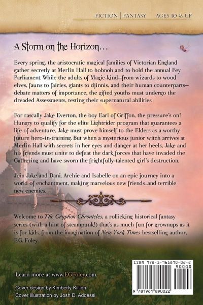 A Storm on the Horizon... Every spring, the aristocratic magical families of Victorian England gather secretly at Merlin Hall to hobnob and hold the annual Fey Parliament. While the adults of Magic-kind - from wizards to wood elves, fauns to fairies, giants to djinnis, and their human counterparts - debate matters of importance, the gifted youths must undergo the dreaded Assessments, testing their supernatural abilities. For rascally Jake Everton, the boy Earl of Griffon, the pressure's on! Hungry to qualify for the elite Lightrider program that guarantees a life of adventure, Jake must prove himself to the Elders as a worthy young hero-in-training. But when a mysterious junior witch arrives at Merlin Hall with secrets in her eyes and danger at her heels, Jake and his friends must unite to defeat the dark forces that have invaded the gathering and have sworn the frightfully-talented girl's destruction. Join Jake and Dani, Archie and Isabelle on an epic journey into a world of enchantment, making marvelous new friends...and terrible new enemies. (368 pages / 139,206 words)