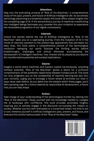 Attention: Step into the enthralling universe of "Rise of the Machines"; a comprehensive study of the past, present, and future of Artificial Intelligence (AI). As we witness technology advancing at a breakneck speed, this book offers unique insights into the compelling saga of Al. If the extraordinary journey of machines transforming into intelligent beings fascinates you, consider this your invitation to experience the remarkable progression of our digital counterparts. Interest: Unlock the secrets behind the rise of Artificial Intelligence as "Rise of the Machines" takes you on a captivating journey. From the inception of Al in the minds of visionary pioneers to the present-day applications that permeate our daily lives, this book paints a comprehensive picture of the technological revolution reshaping our world. Discover the thrilling stories behind breakthroughs, challenges, and ethical dilemmas accompanying the development of intelligent machines. Your interest will be piqued as you explore Al's transformative potential and societal implications. Desire: Imagine a world where machines and humans coexist harmoniously, unlocking limitless potential. "Rise of the Machines" ignites a desire for a profound comprehension of the symbiotic relationship between humans and Al. This book not only enlightens you on the complexities of machine learning but also stirs your curiosity, urging you to envisage a future where Al enriches our lives in ways never seen before. As you delve into the wisdom within these pages, you'll feel a growing urge for a future steered by responsible Al development, a future that you can help shape. Action: Take charge of your understanding of the technological frontier by delving into "Rise of the Machines". Equip yourself with the knowledge needed to navigate the Al landscape with confidence. This book provides actionable insights, inspiring you to actively engage in the discourse surrounding Al's impact on society. Whether you're a tech enthusiast or a concerned citizen, the time to act is now. Immerse yourself in artificial intelligence's past, present, and future, and embrace the transformative power of the "Rise of the Machines" today.