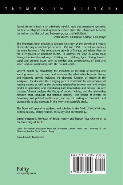 This important book provides a comparative study of the growth and impact of mass literacy across Europe between 1750 and 1950. The volume outlines the main features of the comparative growth of literacy, and relates them to the later growth of electronic media. It assesses the ways in which mass literacy has transformed ways of living and thinking, by exploring broader social and cultural issues such as gender, age, consciousness of time and space, and our relationship with the natural world. Vincent begins by considering the evolution of methods of teaching and learning across the centuries, and examines the relationship between literacy and economic growth, including the changing function of literacy in the workplace. He discusses the changing pattern of demand for and provision of reading matter, as well as the changing relationship between oral and written modes of generating and reproducing both information and fantasy. In later chapters, Vincent analyses the history of popular writing, and the relationship between print, language and national identity. The impact of literacy on democracy and political mobilization, and on the making of censorship and propaganda, is also discussed in this lively and accessible study.
