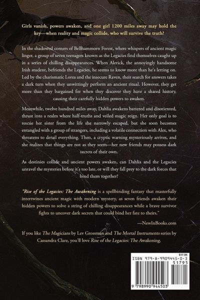 Girls vanish, powers awaken, and one girl may hold the key- when reality and magic collide, who will survive the truth? In the shadowed corners of Bellhammon Forest, where whispers of ancient magic linger, a group of seven friends known as the Legacies find themselves caught up in a series of chilling disappearances. When Alerick, the annoyingly handsome new Irish student, befriends the Legacies, he seems to know more than he's letting. Led by the charismatic Leora and with help from the insecure Raven, their search for answers takes a dark turn when they unwittingly perform an ancient ritual. However, they get more than they bargained for when they discover they have a shared history, causing their carefully hidden powers to awaken. Twelve hundred miles away, Dahlia awakens battered and disoriented, thrust into a world of unsettling half-truths and concealed magic. As she fights to break free and rescue her sister, Dahlia becomes entangled with a group of strangers, including the hostile yet irresistible Alex. Reality blends with illusion, and Dahlia must navigate a captivating web of secrets and danger, where every revelation brings her closer to the truth - whether she's ready for it or not. As destinies collide and ancient powers awaken, can Dahlia and the Legacies unravel the mysteries before it's too late, or will they fall prey to the dark forces that bind them together?
