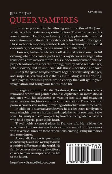 "Immerse yourself in the alluring realm of "Rise of the Queer Vampires," a fresh take on gay erotic fiction. The narrative centers around Antonio De Luca, an Italian youth grappling with his sexual orientation amidst the strict moral codes of his Catholic upbringing. His search for temporary comfort leads him to anonymous sexual encounters, providing fleeting moments of liberation. However, Antonio's life veers off its usual course one fateful evening when he crosses paths with a mysterious stranger who transforms him into a vampire. This sudden and dramatic change propels Antonio on a heart-stopping journey filled with danger, self-discovery, and an unquenchable thirst - for blood and love. "Rise of the Queer Vampires" weaves together sensuality, danger, and suspense, crafting a tale that is as titillating as it is thrilling. Each page is brimming with erotic energy that will ignite your imagination and bring your fantasies to life"--