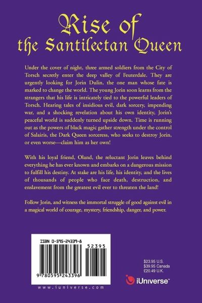 Under the cover of night, three armed soldiers from the City of Torsch secretly enter the deep valley of Feuterdale. They are urgently looking for Jorin Dulin, the one man whose fate is marked to change the world. The young Jorin soon learns from the strangers that his life is intricately tied to the powerful leaders of Torsch. Hearing tales of insidious evil, dark sorcery, impending war, and a shocking revelation about his own identity, Jorin s peaceful world is suddenly turned upside down. Time is running out as the powers of black magic gather strength under the control of Salairis, the Dark Queen sorceress, who seeks to destroy Jorin, or even worse claim him as her own! With his loyal friend, Oland, the reluctant Jorin leaves behind everything he has ever known and embarks on a dangerous mission to fulfill his destiny. At stake are his life, his identity, and the lives of thousands of people who face death, destruction, and enslavement from the greatest evil ever to threaten the land! Follow Jorin, and witness the immortal struggle of good against evil in a magical world of courage, mystery, friendship, danger, and power.