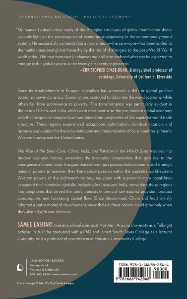 Since its establishment in Europe, capitalism has witnessed a shift in global politico-economic power dynamics. Some nations ascended to dominate the world economy, while others fell from prominence to poverty. This transformation was particularly evident in the case of China and India, which were once central to the pre-modern global economy with their respective empires but transitioned into peripheries of the capitalist world trade structure. These regions experienced occupation, colonization, de-industrialization, and resource exploitation for the industrialization and modernization of core countries, primarily Western Europe and the United States. The Rise of the Semi-Core: China, India, and Pakistan in the World-System delves into modern capitalist history, unraveling the increasing complexities that give rise to the emergence of a semi-core. It argues that nations must possess both economic and strategic national powers to maintain their hierarchical position within the capitalist world-system. Western powers of the eighteenth century, equipped with superior military capabilities, expanded their dominion globally, including in China and India, converting these regions into peripheries that served the core's interests in terms of raw material provision, product consumption, and facilitating capital flow. Once decolonized, China and India initially adopted a statist model of development, nevertheless these nations could grow only when they aligned with core interests.