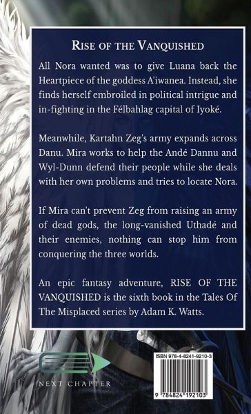 All Nora wanted was to give Luana back the Heartpiece of the goddess A'iwanea. Instead, she finds herself embroiled in political intrigue and in-fighting in the Félbahlag capital of Iyoké. Meanwhile, Kartahn Zeg's army expands across Danu. Mira works to help the Andé Dannu and Wyl-Dunn defend their people while she deals with her own problems and tries to locate Nora. If Mira can't prevent Zeg from raising an army of dead gods, the long-vanished Uthadé and their enemies, nothing can stop him from conquering the three worlds. An epic fantasy adventure, RISE OF THE VANQUISHED is the sixth book in the Tales Of The Misplaced series by Adam K. Watts.