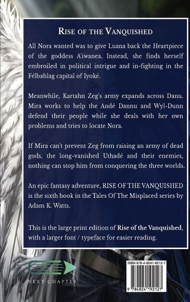 All Nora wanted was to give Luana back the Heartpiece of the goddess A'iwanea. Instead, she finds herself embroiled in political intrigue and in-fighting in the Félbahlag capital of Iyoké. Meanwhile, Kartahn Zeg's army expands across Danu. Mira works to help the Andé Dannu and Wyl-Dunn defend their people while she deals with her own problems and tries to locate Nora. If Mira can't prevent Zeg from raising an army of dead gods, the long-vanished Uthadé and their enemies, nothing can stop him from conquering the three worlds. An epic fantasy adventure, RISE OF THE VANQUISHED is the sixth book in the Tales Of The Misplaced series by Adam K. Watts. This is the large print edition of Rise of the Vanquished, with a larger font / typeface for easier reading.