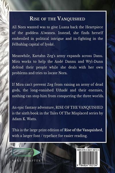 All Nora wanted was to give Luana back the Heartpiece of the goddess A'iwanea. Instead, she finds herself embroiled in political intrigue and in-fighting in the Félbahlag capital of Iyoké. Meanwhile, Kartahn Zeg's army expands across Danu. Mira works to help the Andé Dannu and Wyl-Dunn defend their people while she deals with her own problems and tries to locate Nora. If Mira can't prevent Zeg from raising an army of dead gods, the long-vanished Uthadé and their enemies, nothing can stop him from conquering the three worlds. An epic fantasy adventure, RISE OF THE VANQUISHED is the sixth book in the Tales Of The Misplaced series by Adam K. Watts. This is the large print edition of Rise of the Vanquished, with a larger font / typeface for easier reading.