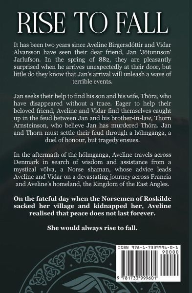 It has been two years since Aveline Birgersdóttir and Vidar Alvarsson have seen their dear friend, Jan 'Jötunnson' Jarlufson. In the spring of 882, they are pleasantly surprised when he arrives unexpectedly at their door, but little do they know that Jan's arrival will unleash a wave of terrible events. Jan seeks their help to find his son and his wife, Thóra, who have disappeared without a trace. Eager to help their beloved friend, Aveline and Vidar find themselves caught up in the feud between Jan and his brother-in-law, Thorn Arnsteinson, who believe Jan has murdered Thóra. Jan and Thorn must settle their feud through a hólmganga, a duel of honour, but tragedy ensues. In the aftermath of the hólmganga, Aveline travels across Denmark in search of wisdom and assistance from a mystical völva, a Norse shaman, whose advice leads Aveline and Vidar on a devastating journey across Francia and Aveline's homeland, the Kingdom of the East Angles. On the fateful day when the Norsemen of Roskilde sacked her village and kidnapped her, Aveline realised that peace does not last forever. She would always rise to fall. This novel contains graphic violence, sexual content and inappropriate language. Reader discretion is advised.