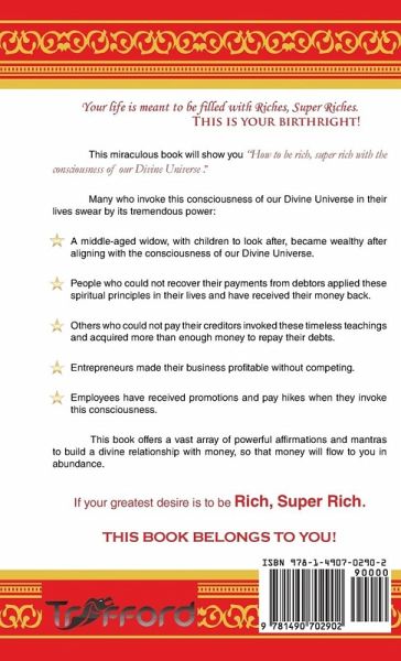 Your life is meant to be filled with Riches, Super Riches. This is your birthright! This miraculous book will show you ¿How to be rich super rich with the consciousness of our Divine Universe. Many who invoke these consciousnesses of our Divine Universe in their lives swear by its tremendous power: A middle-aged widow with children to look after became wealthy after aligning with the consciousness of our Divine Universe. People who could not recover their payments from debtors applied these spiritual principles in their lives and have received their money back. Others who could not pay their creditors invoked these timeless teachings and acquired more than enough money to repay their debts. An entrepreneur friend made her business profitable without competing. Employees have received promotions and pay hikes when they invoke these consciousnesses. This book offers a vast array of powerful affirmations and mantras to build a divine relationship with money so that money will flow to you in abundance. If your greatest desire is to be Rich, Super Rich. THIS BOOK BELONGS TO YOU!