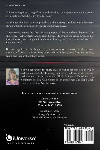 "The morning rises to engulf my world revealing the majestic beauty with beams of infinite warmth. So is my love for you." "And when the dusk hours approach and the evening sun dims with a heavenly glow, I will hold you close for you are my Forever Love." These words, penned by Tim, share a glimpse of the love shared between Tim and Becky. Author Becky Spell share's her real life stories and adventures and her revelations of Love being the foundations of nearly everything in life in "Rise Up, Recount Love". Become engulfed in the laughter, joy, tears, sadness, but most of all, the true meaning of Love in this inspiring work. You will find yourself inspired to live, laugh, and love with all that you are. Learn more about the ministry or contact us at: Tim's Gift Inc. 108 Northeast Blvd. Clinton, N.C. 28328 www.timsgift.com tims.gift@yahoo.com Tim's Gift Clinton on Facebook