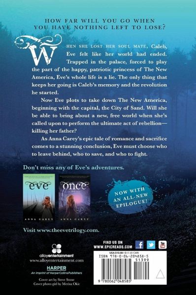 How far will you go when you have nothing left to lose? When she lost her soul mate, Caleb, Eve felt like her world had ended. Trapped in the palace, forced to play the part of the happy, patriotic princess of The New America, Eve's whole life is a lie. The only thing that keeps her going is Caleb's memory and the revolution he started. Now Eve plots to take down The New America, beginning with the capital, the City of Sand. Will she be able to bring about a new, free world when she's called upon to perform the ultimate act of rebellion?killing her father? As Anna Carey's epic tale of romance and sacrifice comes to a stunning conclusion, Eve must choose who to leave behind, who to save, and who to fight.