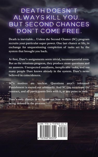 Not even death can kill you... Dare should be dead. You don't get hit by a high voltage power line in a freak accident and live. Unless the Second Chance program wants you for its own ends, that is. A second life, one last chance, but at the cost of serving an aeons old system that protects humanity... even from itself. The tasks Dare is assigned seem harmless at first, but as the missions progress, things seem off. There are creatures the system can't see, plans that go awry. Too many people Dare knows are involved already, a coincidence Dare can't help but wonder at. The system's motives are unclear, it doesn't like to be questioned, and it won't tolerate being disobeyed. SC can terminate the contract, and Dare's life with it, at its discretion. Dare's only chance is to follow where the tasks lead, no matter the cost.