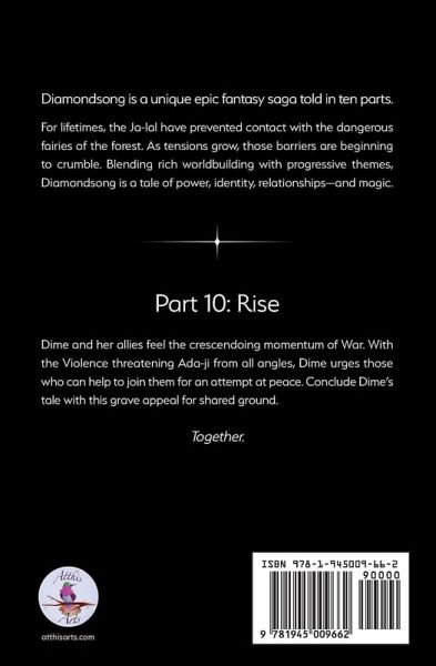 Diamondsong is a unique epic fantasy saga told in ten parts. For lifetimes, the Ja-lal have prevented contact with the dangerous fairies of the forest. As tensions grow, those barriers are beginning to crumble. Blending rich worldbuilding with progressive themes, Diamondsong is a tale of power, identity, relationships-and magic.